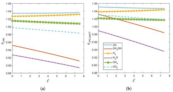 Fugacity coefficients as function of extent of reaction I computed with (a) Peng–Robinson EoS and (b) PC-SAFT EoS.