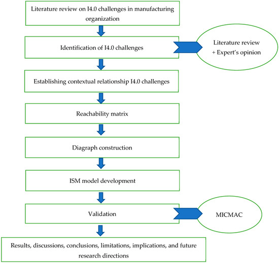 To analyse the above research questions, this study starts by identifying research articles relevant to the investigating field. Scopus database was used to collect the relevant work in the investigating field [30,31]. The identified articles were studied, and I4.0 challenges were shortlisted from the literature review. A modeling approach named interpretive structural modeling (ISM) was used in the present study to develop a structural model of identified challenges. The hierarchical model was developed that depicts the most dominant challenges in embracing I4.0 disruptive technologies in the manufacturing sector. Further, the results are theoretically validated using “Matrice cross-impact multiplication applied to a classification” (MICMAC) evaluation. This study helps the decision maker for the effective implementation of I4.0 technologies in the manufacturing sector.