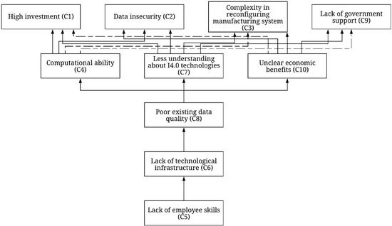 Group B—Dependent—The challenges of high dependence and low driving power were considered in the Dependent category. The challenges ‘Data insecurity (C2)’ and ‘Complexity in reconfiguring manufacturing system (C3)’ formed the dependent group.