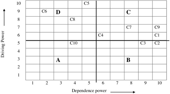 Group C—Linkage—The challenges of having high driving and dependence power were placed into the Linkage group. The challenges are ‘High investment (C1)’, and ‘Lack of government support (C9)’. The challenges ‘Computational ability (C4)’ and ‘Lack of understanding about I4.0 technologies (C7)’ were found in the Linkage group.