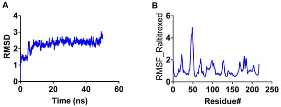 RMSD was calculated for the raltitrexed-TbDHFR-TS complex. The RMSD graph (Figure 3) shows that the structure remained stable throughout the simulation time with some fluctuation within the range of ~1 Å, which is a normal behavior of the globular protein. The raltitrexed-TbDHFR-TS complex reached stability within five ns at the start of the simulation (Figure 3A). These findings support the observed docking scores and the strong binding of raltitrexed with TbDHFR-TS. The raltitrexed-TbDHFR-TS complex showed low RMSF and indicated modest variations of amino acid residues, with the exception of a flexible loop made up of residue no. 45–55 (Figure 3B).