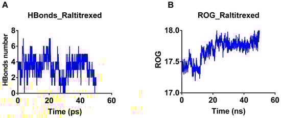 The total number of hydrogen bonds formed between raltitrexed and TbDHFR-TS was traced during 50 ns simulation (Figure 4A). The hydrogen bonding statistics indicated that hydrogen bonds ranged from 0–7 with a mean value of 3.38 ± 1.3. This indicates the fixation and consistent binding of raltitrexed with TbDHFR-TS. The slight changes (Figure 4B) in ROG indicate the general compactness of the raltitrexed–TbDHFR-TS complex.