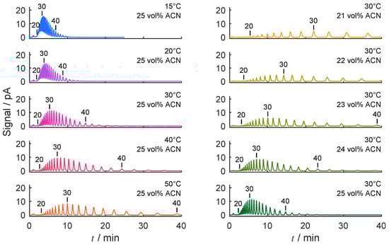 Example chromatograms demonstrating the roles of temperature and mobile phase composition for the separation of PEG 1400. For better orientation, peaks are marked for the homologs with n = 20, 30, and 40, respectively. Left—five different temperatures (15, 20, 30, 40, 50 C), using 25vol % acetonitrile (ACN) in water as eluent. Right—five different eluent compositions (21, 22, 23, 24, and 25vol % ACN in water) at 30 C. Remark: The chromatogram in the left (middle) is the same as the one in the right (bottom).