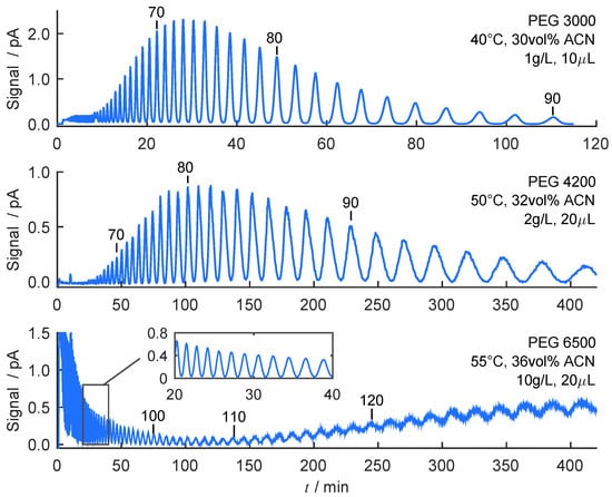 Selected examples for the separation of larger PEGs. Conditions (see labels) were adjusted to achieve about baseline resolution. Top—PEG 3000 (average degree of polymerization = 68). Middle—PEG 4200 ( = 95; the actual average MW was estimated as 3900 g/mol). Bottom—PEG 6500 ( = 136). The inset shows the separation of the many small homologs with low retention times.