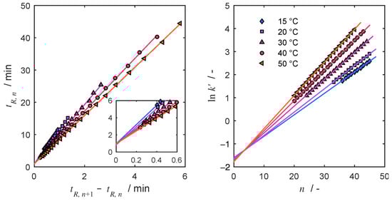 Next, the retention factors are determined from Equation (15) for all measured chromatograms. As an example, Figure 4 (right) shows the results for the chromatograms in Figure 1 (left). The values for all series follow straight lines, confirming the validity of Martin’s rule. Linear plots were also obtained for all other conditions. It is worth mentioning that when values calculated from pycnometry or tracer peaks were used, the obtained Martin’s plots were not linear.