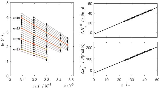 With the applicability of Martin’s rule confirmed, the thermodynamic parameters of the retention model can be determined. As shown in Figure 5 (left), a van’t Hoff plot ( vs. ) of the data from Figure 1 (left) yields almost perfectly straight lines. According to Equation (5), the linear regression for each homolog n delivers and as the slopes and intercepts, respectively. In Figure 5, these values are plotted against n, which gives, again, linear trends. The slopes and intercepts of these lines are the enthalpic and entropic contributions in Equation (Section 2.1) for the repetitive units (, ), and the end groups (, ), respectively. This procedure was performed for all mobile phase compositions, and in all cases, linear van’t Hoff plots and linear dependencies on n were obtained. The corresponding diagrams are given in the supplement (ibid., Figures S3–S6).