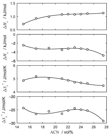While we observe a slight increase of with the increasing ACN level, it remains open if this trend will continue for larger ACN concentrations. For a somewhat larger PEG and higher ACN levels (35 and 45 vol %), Cho et al. [15] observed a decrease of (last two lines in Table 1).