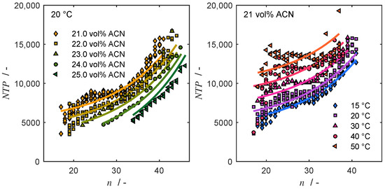 In contrast to the evaluation of retention times, which yielded ‘clean’ linear trends in the frame of the theory, the values deliver a more complex picture. Figure 7 exemplifies this for the chromatograms obtained using PEG 1400. Again, only peaks with a resolution of were considered. First, one recognizes that the rather short core–shell column is remarkably efficient, showing values up to about 15,000. Second, one observes that generally increases with the degree of polymerization, n. The reason for this is the strongly increasing sorption with n, which reduces the dispersion due to mass transfer resistances. This effect is stronger than the increasing dispersion due to slower free bulk diffusion for larger n. Third, decreases with increasing ACN level (see Figure 7, left), while it increases with T (Figure 7, right). Obviously, also here, the strongly increasing sorption is responsible for the effects of both T and ACN on .