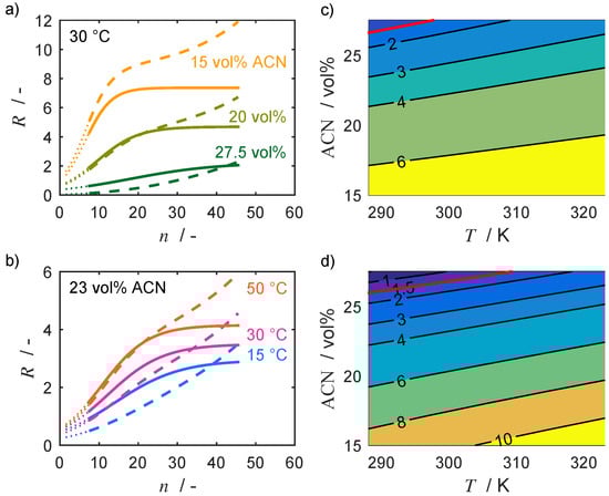 Finally, it is also possible to use Equation (20) for predicting suitable operating conditions for homologs of given size. This is demonstrated by the contour maps in Figure 8 (right) for the example of homologs n = 32 and n = 33. The maps allow selecting the temperature and acetonitrile content that are required to achieve a certain desired value of resolution. Again, differences arise when assuming constant , Figure 8c, or interpolated values, as shown in Figure 8d. However, conditions required for baseline separation (, red lines) are similar. It is worth noting that such contour maps may give helpful indications also for designing gradients of solvent strength or temperature.