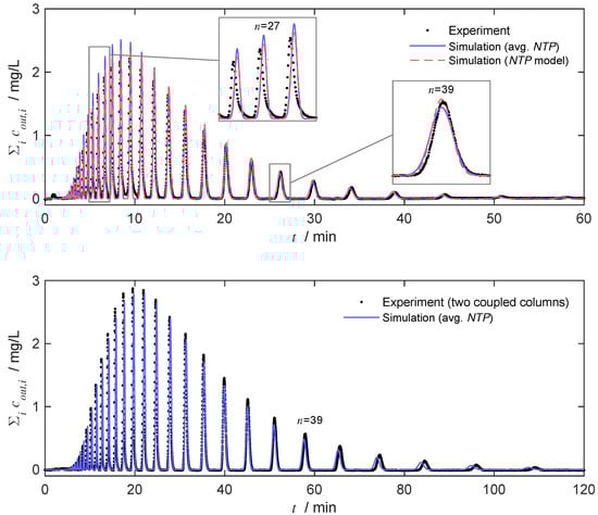 Validation of the modeling approach by discrete convolution. Symbols—experimental data, lines—simulated total outlet concentration, , acc. to Equation (12). Top—Independent experiment not used for parameter determination (25 vol % ACN, 43.8 C, 1 mL/min, 10 L of PEG 1400, 1 g/L). Simulations with averaged ( = 9700) and interpolated values for , respectively. Bottom—Experiment with two coupled columns of the same size, simulated with averaged = 10,000 for each column (25 vol % ACN, 40 C, 0.7 mL/min, 100 L of PEG 1400, 0.1 g/L).