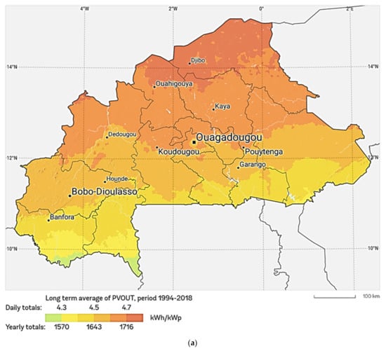 The Essakane gold mine is located in northeastern Burkina Faso (Ouest, Africa). The geographical coordinates of the mine are defined as follows: latitude 14°22′59″ N and longitude 0°4′34″ E. Figure 1 shows the country solar resource map, provided by World Bank Group for preliminary studies.