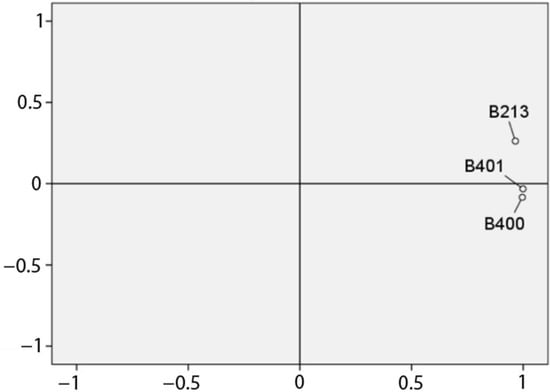 The confirmation of the study is also achieved by the principal component analysis (PCA) since, from Figure 2, is possible to see that, according to the eigenvalue, two groups are formed: group number 1, consisting out of B-400 and B-401 strains and group number 2, consisting out of B-213 strain. These statistical analysis results are in accordance with the obtained results since no statistically significant (p < 0.05) differences were obtained between B-400 and B-401 strains.
