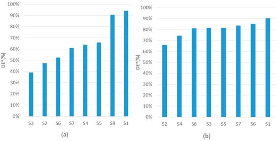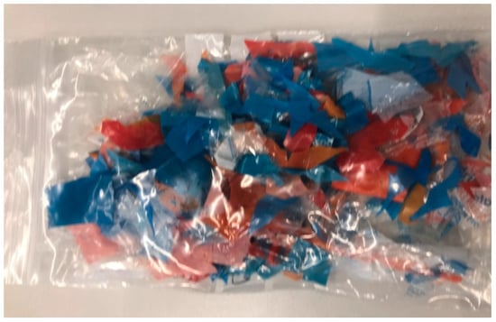 Due to the inhomogeneity of the post-consumer plastic waste, the cleaned samples were manually selected into three categories: completely transparent, partly transparent, and not cleaned. Then, the weight of the three categories were measured, and the DE* was calculated by Equation (2).