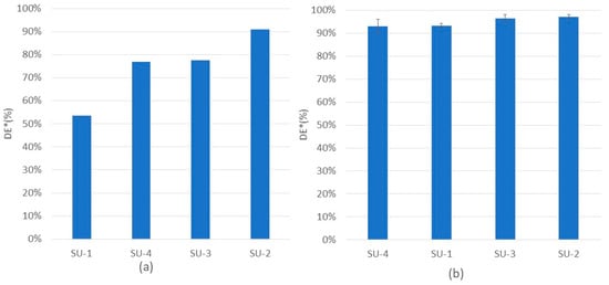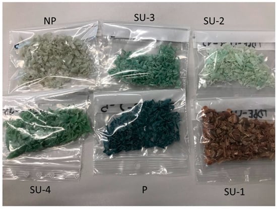 In the scaled-up experiment, comparable de-inking effects were obtained from the CIELAB method (Figure 6a) and flake sorting methods (Figure 6b). However, after extrusion and test specimen production by injection molding, the sample SU-2 showed the best de-inking performance under the CIELAB method. In contrast, the sample treated under pH 10 showed a brownish color, which might have resulted from the degradation product of nitrocellulose. The samples SU-3 and SU-4 showed a slightly worse de-inking effect than SU-2. This difference is also amplified by the CIELAB method, as the color remains evenly distributed in the sample in the extrusion process. No evidential difference in the de-inking performance between pH 10 and 12 was inspected for the samples treated with nonionic surfactant, which confirms the result from the small-scale experiment.