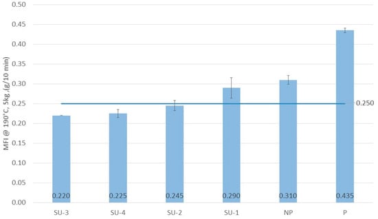 From Figure 7, samples SU-2, SU-3 and SU-4 showed a similar melt flow index of 0.245, 0.225, and 0.220 g/10 min, respectively, which were lower than the non-printed sample (NP, MFI = 0.31). On the other hand, the printed sample (P) under mechanical recycling showed the highest melt flow index (MFI) of 0.435 g/10 min at 5 kg and 190 °C, which was even higher than the extruded non-printed part. According to the literature, the MFI value of LDPE for film blowing should have a minimum MFI of 0.25 g/10 min at 190 °C and 5 kg, indicated in Figure 7 with a blue line as a benchmark [].