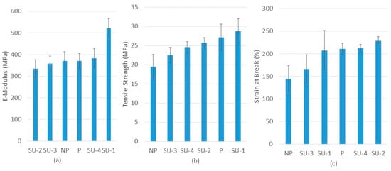 - A tensile strength testing machine (Zwick & Roell Z2.5) was applied to measure the elongation modulus, the tensile strength, and strain at the break of the recyclates according to ISO 527 []. Each sample was measured with five replications.