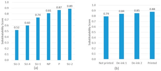 Substitutability score of the LDPE recyclates from (a) the scaled-up experiment of this study and (b) calculated from the data in [].