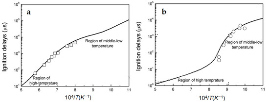 Temperature dependence of ignition delays for methane (a) and hydrogen (b). Symbols—experimental data, lines—kinetic calculation results (adapted from [25]).