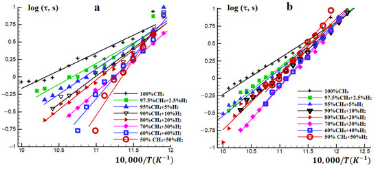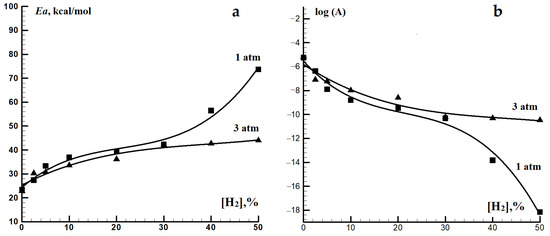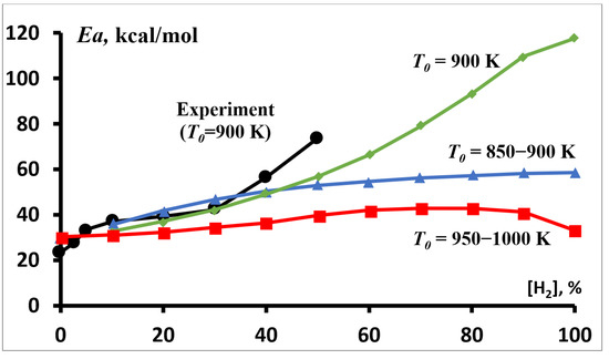 The experimental results we obtained for T0 = 900 K (Figure 7), taking into account various factors that can introduce errors [28,29], are in good agreement with the simulation results. When hydrogen concentration in the mixture is changed from zero to 50%, the experimentally determined activation energy of the autoignition delay time of methane–hydrogen mixtures increased monotonically from 23.4 kcal/mol to 73.7 kcal/mol.