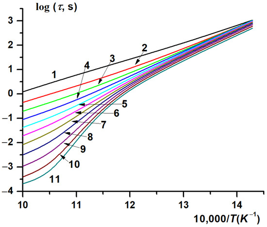 Calculated temperature dependence of the autoignition delay time of stoichiometric CH4-H2-air mixtures on the initial temperature at different concentrations [H2] (%): 0 (1), 10 (2), 20 (3), 30 (4), 40 (5), 50 (6), 60 (7), 70 (8), 80 (9), 90 (10), 100 (11). P0 = 1 atm.