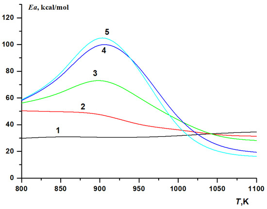 It should also be noted that in low temperatures, T < 850 K, the effective activation energy for the autoignition delay time of hydrogen and hydrogen-containing mixtures is higher than the effective activation energy of the autoignition delay time for methane (Figure 5). Possible reasons for this will be discussed below. For mixtures with a hydrogen concentration of up to 40 vol%, the effective activation energy of the autoignition delay time decreases monotonically with increasing temperature, becoming lower than that for methane at T > 1100 K (Figure 5, curve 2). For methane–hydrogen mixtures with a high hydrogen content, as well as for hydrogen itself, the effective activation energy of the autoignition delay time passes through a maximum near T = 900 K, but at T > 1100 K it also becomes lower than that for methane. At the same time, the higher the hydrogen content in the mixture, the lower it is (Figure 5).