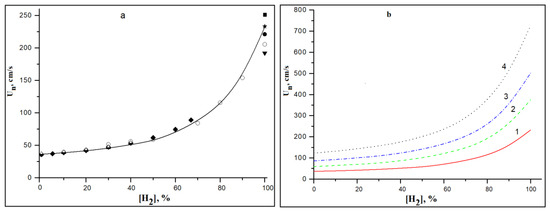 Dependence of laminar burning velocity Un in stoichiometric of CH4–H2-air mixtures on the concentration of hydrogen. (a) T0 = 293 K (line—calculation by the mechanism [31,32], symbols—experimental values from literary sources: ∆—[38], o—[40], ♦—[41], ●—[42], ▼—[43], ★—[44], ■—[45]. (b) Calculation at T0 (K): 1—300, 2—400, 3—500, 4—600.