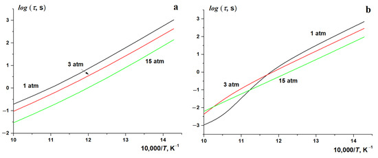 The results show that for [H2] = 20% in the entire temperature range covered at all pressures used, the temperature dependence of the autoignition delay time of stoichiometric methane–hydrogen mixtures has an Arrhenius form. In the entire temperature range, an increase in pressure promotes the ignition (Figure 9a). This confirms the conclusion that the oxidation of methane–hydrogen mixtures with low hydrogen content occurs mainly by the methane mechanism. However, the results are drastically different for mixtures with [H2] = 80%, the oxidation of which proceeds via the hydrogen mechanism [24,25]. While at P0 = 15 atm, the Arrhenius character of the dependence holds, at P0 = 3 atm, it becomes somewhat distorted, being obviously violated at P0 = 1 atm (Figure 9b). At the same time, while in the low-temperature part of this range, an increase in pressure promotes the autoignition, i.e., reduces the ignition delay time, in its high-temperature part, on the contrary, it inhibits the process. A fundamental change in the nature of the influence of pressure on the ignition process occurs near T ≈ 900 K. These results are in fairly good agreement with the results presented in Figure 8 [24], showing that, for hydrogen with an increase in pressure, the dependence of the autoignition delay time becomes closer to the Arrhenius expression.