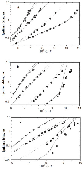 - Burcat, A.; Scheller, K.; Lifshitz, A. Shock-tube investigation of comparative ignition delay times for C1-C5 alkanes. Comb. Fl. 1971, 16, 29–33. [Google Scholar] [CrossRef]