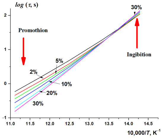 Note that at high temperatures, the autoignition delay time shortens significantly with increasing hydrogen concentration, i.e., hydrogen promotes the ignition of methane. However, at lower temperatures T ≈ 850 K, the promotion effect is weak, if any (Figure 2). An increase in pressure narrows the range of changes in the effective activation energy of the autoignition delay time with a change in the hydrogen concentration in the mixture.