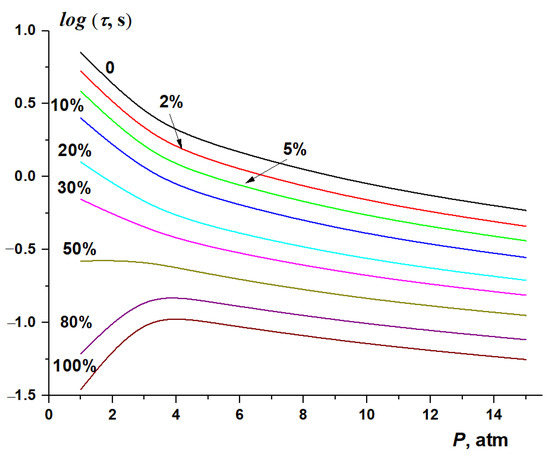 The calculated dependence of the autoignition delay time of methane–hydrogen–air mixtures with different hydrogen concentration on the pressure in the range from 1 to 15 atm at T0 = 900 K is shown in Figure 12. With low hydrogen concentration, the autoignition delay time monotonically decreases with increasing pressure. However, for hydrogen itself and for mixtures with its high concentration, pressure increases the autoignition delay time of methane–hydrogen–air mixtures at low pressures, leading to the appearance of a maximum at P ≈ 3 atm. Only at higher pressures is a monotonous decrease in the autoignition delay time is observed.