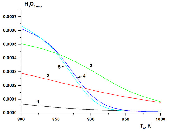 As the temperature increases, the activity of hydroperoxide radicals HO2• and the rate of decomposition of hydrogen peroxide increase. In the vicinity of T ≈ 900 K, the rate of decomposition of hydrogen peroxide becomes quite high, and its maximum concentration rapidly decreases with increasing temperature (Figure 14). Therefore, at temperatures above 900 K, the recombination of HO2• radicals ceases to inhibit the process, which leads to a significant change in the mechanism of the oxidation of hydrogen and mixtures with its high content. This temperature region of the fundamental change in the mechanism is known in the literature as “H2O2 turnover” [56]. In addition, with increasing initial temperature, the role of branching reaction (7) grows rapidly so that hydrogen oxidation becomes a branched-chain process. With high hydrogen content, this manifests itself as a rapid decrease in the effective activation energy of the autoignition delay time. The changes in the mechanism of hydrogen oxidation described above lead to the appearance of a maximum in the temperature dependence of the autoignition delay time of hydrogen and mixtures with its high content (Figure 5).