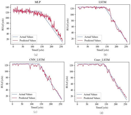 Table 3 shows the average error results for the four engine data sets FD001 to FD004 using five different methods. Table 3 shows that MLP has the worse prediction performance across all data sets. Because MLP has a simplistic structure and cannot consider data’s temporal relationship, it cannot produce accurate predictions for complex time series data sets. LSTM outperforms MLP in data prediction because it can capture the dynamic character of process data. It can store the nonlinear features extracted by the nonlinear activation function through the loop unit to complete the time extraction function, and then the data is filtered by the ‘gate structure’. When there are multiple characteristics in the data, however, LSTM cannot determine the coupling relationship between them. CNN-LSTM can mine the association between features more effectively than LSTM prediction. Conv-LSTM is a replacement for CNN-LSTM that only addresses the extraction of single-step spatial coupling information of data while neglecting the fact that data coupling information may change over time, hence its effect is superior to CNN-LSTM. The Conv-LSTM module in the proposed AT-CONVLSTM model can not only extract the spatial characteristics of the feature in a single step time, but it can also mine the spatial features that change with time adaptively. In addition, the module can calculate the attention weight of the input variable by hiding the state variable and the current input, which can better identify the input variables related to the RUL prediction, so the method has higher prediction accuracy. Figure 7 shows the prediction results of MLP, LSTM, CNN-LSTM, and the proposed method on the FD003 data set. It can be seen from Figure 5 that the prediction performance based on MLP, LSTM, and CNN-LSTM is poor. Although their prediction results can follow the actual change trend, the change fluctuates greatly. For predictions based on Conv-LSTM, the prediction curve can better track changes in measurements, but there is still a large deviation between the predicted output and the measured output. For the AT-CONVLSTM model, the predicted results track the actual curve well.