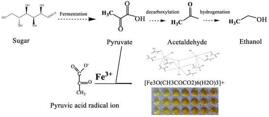 Pyruvate is a key metabolite of cell metabolism [18] that is not only involved in energy metabolism but is also a precursor of ethanol synthesis. During normal pyruvate (or pyruvic acid radical ion) metabolism, excess product is expelled from the cell. Yeast strains with high pyruvate yields have been developed [19]; measuring extracellular pyruvate (or pyruvic acid radical ion) concentration can be a more reliable gauge of ethanol synthesis. Fe3+ can react with pyruvate or pyruvic acid radical ions, but no other organic acids, to form a yellow complex ([Fe3O(CH3COCO2)6(H2O)3]+) (Supplement Figure S1) that is visible at 520 nm [20].