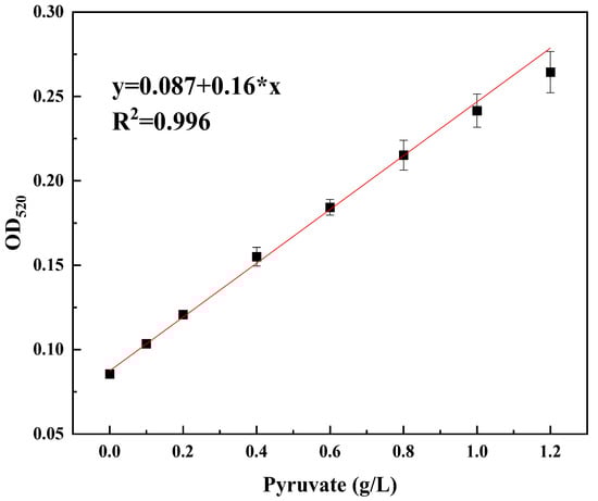 While the determination of ethanol concentration using GC is highly accurate, it is cumbersome, time-consuming, and not always suitable for high-throughput screening. In addition, pyruvate testing kits are expensive and the pyruvic acid radical ion is difficult to measure. Thus, establishing a cheap, efficient screening method is critical. S. cerevisiae uses carbon metabolism to synthesize pyruvate, which reacts with pyruvate decarboxylase to form acetaldehyde, which then reacts with ethanol dehydrogenase to form ethanol (Figure 1). Ferric nitrate can react with the pyruvate or pyruvic acid radical ion, but no other organic acids, to form a yellow complex [20]. To characterize the reaction relationship in more detail, 120 µL pyruvate standard at different concentrations was added to 80 µL ferric nitrate (1 M). There was a linear relationship between different pyruvate concentrations and the OD520 (Figure 2). A strong linear relationship of R2 = 0.996 was demonstrated, ensuring the accuracy of data filtering.
