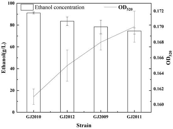 Four S. cerevisiae strains, GJ2009, GJ2010, GJ2011, and GJ2012 (derived from GJ2008 by ARTP mutagenesis (data not shown)), with different ethanol synthesis capacities, were verified by fermentation under 190 g/L sucrose after 30 h (Figure 3). While the ethanol yield of GJ2010, GJ2012, GJ2011, and GJ2009 increased successively, the OD520 value of fermentation broth measured using the Py-Fe3+ method decreased successively. The real-time detection from the ethanol synthesis curve was shown in Supplement Figure S2. More research is needed to reveal the mechanism. Thus, the ethanol synthesis ability of S. cerevisiae-derived strains was inversely proportional to the concentration of pyruvate (or pyruvate radical ions) in the fermentation broth. Pyruvate is one of the important precursors in microorganisms. The amount of pyruvate synthesized by microorganisms and its utilization rate will largely determine the growth and performance of cells. Therefore, we speculated that the pyruvate content produced by S. cerevisiae cells of the same derivative strain at the same period was comparable, but the yeast strain with stronger metabolic transformation ability would accelerate its utilization. Therefore, it was concluded that the amount of ethanol synthesis in the paper was inversely proportional to the pyruvate (or pyruvate radical ions) content in the fermentation broth. Moreover, as can be seen in Figure 3, with the increase of ethanol content the OD520 value did not significantly decrease, which may be the result of the increase of the volume of the yeast. Genomic resequencing and comparative transcriptomic analysis may be ideal means to reveal the results of this experiment, which will be published in a subsequent paper.