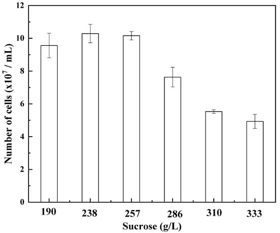 Increasing the sugar concentration in fermentation broth is a direct way to increase ethanol production. However, high sugar concentrations cause increased osmotic pressure and stress cell growth and vitality which in turn leads to a further decrease in yield. Thus, ARTP mutagenesis and adaptive evolution are used to improve the robustness of S. cerevisiae in the presence of high concentration sucrose. To find an appropriate inhibitory concentration of sucrose for the initiation of mutagenesis, we first tested the effect of different sucrose concentrations on the growth of Saccharomyces cerevisiae GJ2008 (Figure 4) and found that S. cerevisiae cell numbers peaked at 238 g/L sucrose. Thus, after ARTP mutagenesis, the mutant yeast library was cultured and subcultured in a 286 g/L sucrose fermentation medium. After stable growth was achieved, another round of mutagenesis was carried out at a sucrose concentration of 381 g/L (Supplement Figure S3). The cell morphology also changed from a state of initial inhibition (Supplement Figure S4A; cells were shriveled and sticky) to a state of release (Supplement Figure S4B; cells were scattered and plump), which may be the reason for improved tolerance and increased yield.