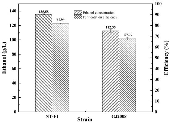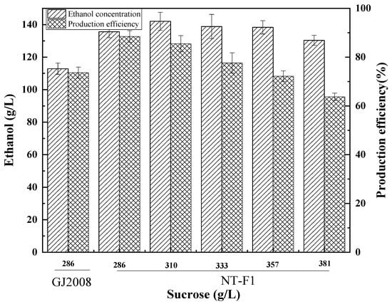 Sucrose fermentation media of 286, 310, 333, 357, and 381 g/L were used to determine the conditions for optimal ethanol production (Figure 6). In media with a 310 g/L sucrose concentration, the ethanol yield by the mutant strain of NT-F1 reached 135.58 g/L (17.18% (vol)) and the production efficiency was 81.64%. The ethanol yield of the parent strain GJ2008 reached the highest at 286 g/L sucrose concentration, which was only 112.55 g/L (the production efficiency was only 70.25%) (Figure 7). The ethanol yield of NT-F1 was 20.48% higher than that of parent strain GJ2008. In addition, the mutant strain NT-F1 had a higher growth performance in a high-sugar environment than the parent strain GJ2008 (Figure 8). This may explain the increase in ethanol production.