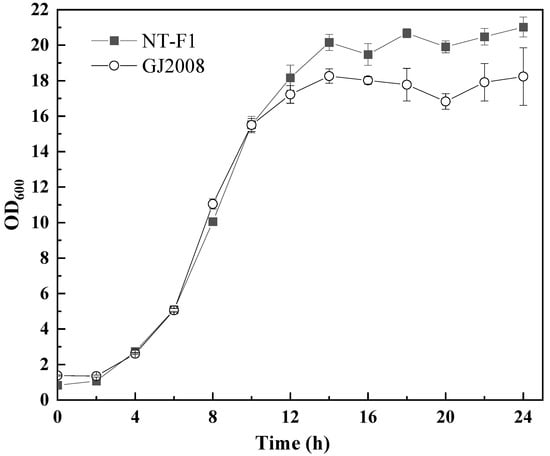 Comparison of growth capacity of mutant and non-mutant strain. The mutant strain NT-F1 compared with non-mutant strain GJ2008 under 310 g/L sucrose.