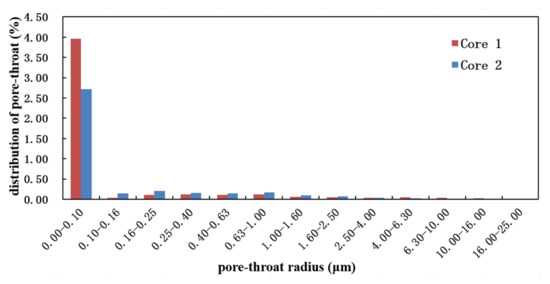 The pore-throat radius in Figure 3 indicates that it is not difficult to find that, no matter core 1 or core 2, the peak value of pore-throat distribution is 0~0.1 μm. Core 1 was of poor quality with a pore-throat of less than 0.1 μm accounting for 84.19%, and core 2 with a pore-throat less than 0.1μm accounting for 71.62%.