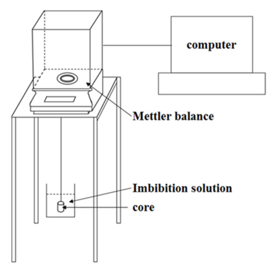 Figure 4 shows the experimental device of the imbibition mass method. The core was hung on the mettler balance through a thin line and soaked in imbibition solution. The mettler balance was connected with the computer to record the change of core quality with time. Because the core was hydrophilic, water entered the core to replace oil during imbibition, and the quality change of the core was the difference of oil–water quality. The imbibition oil recovery could be calculated through the quality change.