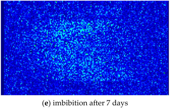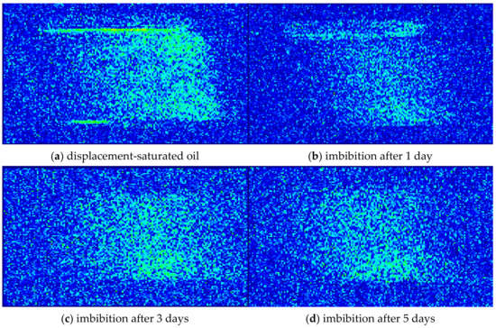 Figure 5a–e respectively show the pseudo-color processing images of core 1 after displacement-saturated oil and 1, 3, 5, and 7 days of imbibition. The fluorescence indicates that the region occupies the oil phase, and the deeper the fluorescence, the higher the oil phase content in the region. As can be seen from the figures, after the core is saturated with kerosene, kerosene firstly occupies the fractures with strong conductivity. As shown in Figure 5a, there are two significant fluorescent bands. With the increase of time, the fluorescence intensity of the core slowly decreases, indicating that there is a significant fluid replacement between the core and the MnCl2 imbibition solution in the beaker, especially at the fracture position. After 1 day of imbibition, the fluorescence intensity of the two prominent fluorescent bands decreases significantly, which indicates that the kerosene in the fractures is first replaced by the MnCl2 imbibition solution.