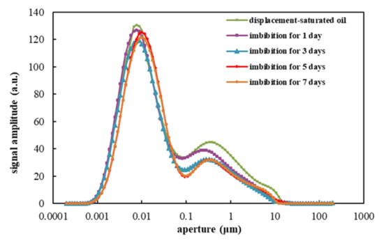 - In the process of spontaneous imbibition, the peak value of the NMR curve corresponding to a pore-throat smaller than 0.02 μm shifts to the right. This is because the capillary force is the main force, and the water phase enters the displacement fluid from the smaller pore-throat to the larger pore-throat. The peak value of the NMR curve corresponding to a pore-throat larger than 0.02 μm slightly deviates to the left, because the displacement of oil and water in the fracture is more manifested by gravity, and the water phase enters the displacement fluid from the larger pore throat to the smaller pore throat;