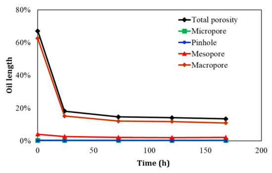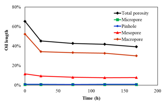 We classify the cores into four categories: a pore diameter of less than 0.025 μm is a micropore, a pore diameter of 0.025~0.1 μm is a pinhole, a pore diameter of 0.1~1 μm is a mesopore, and a pore diameter of more than 1 μm is a macropore. The time-varying curves of oil length in core 1 different levels of pore-throat are shown in Figure 7. The total oil length of core 1 decreases from 65.4% to 39.3% and, after 168-h of imbibition, the core oil recovery reaches 40.0%. The macropore oil length decreases from 52.3% to 29.9%, contributing 85.5% of the total imbibition oil recovery. The mesopore oil length decreases from the initial 11.5% to 7.7%, contributing 14.3% of oil recovery. Contributions of the micropore and the pinhole to recovery are negligible.