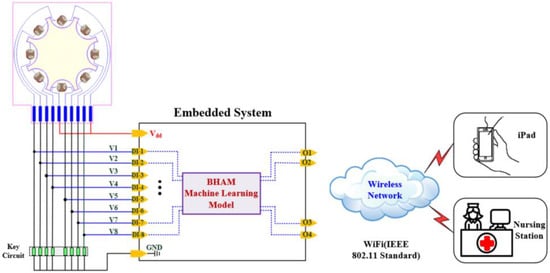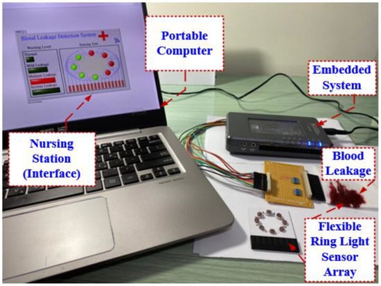 In the current study, we sought to combine the benefits of existing systems by creating a ring-light sensor array on a flexible printed circuit board (FPCB) [15,16,17] (see Figure 3). The light sensor is a semiconductor, the resistance of which decreases inversely with the intensity of the light striking it. Blood covering the light sensor can increase the photo-resistance by several kiloohms (KΩ) or even megaohms (MΩ). A bleeder circuit and voltage follower transmit changes in voltage to an embedded computing unit, in which a bidirectional hetero-associative memory (BHAM) network machine learning model [18,19,20] determines the severity of the blood leakage. The portability of the unit was ensured by moving the alarm system to the nursing station to which an alarm is transmitted using a WiFi wireless network (IEEE 802.11 standard WLAN [21,22,23]). Experiments using artificial blood verified the efficacy of the proposed system.