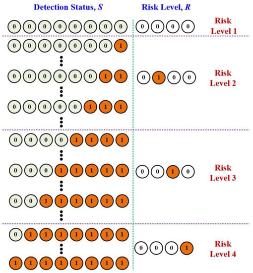 where sensing state Si = 1 indicates the logic state “High (1)” and Si = 0 indicates logic state “(0)”. Thus, sensor detection status can be derived from the 8-bit binary number as follows: S = [s1, s2, s3, s4, s5, s6, s7, s8] = [0/1, 0/1, 0/1, 0/1, 0/1, 0/1, 0/1, 0/1]. This generates 28 = 256 binary patterns corresponding to each R = [0/1, 0/1, 0/1, 0/1] pattern, as shown in Figure 5. Note that a value of “1” indicates the detection of an anomaly at that point, whereas a value of “0” indicates no anomaly. For example, an output pattern of R = [0 0 0 0] would indicate risk level 1 (normal state), whereas R = [0 1 0 0] would indicate risk level 2 (mild blood leakage), R = [0 0 1 0] would indicate risk level 3 (moderate blood leakage), and R = [0 0 0 1] would indicate risk level 4 (serious blood leakage). Hence, the combinations generated by the four risks level were as follows: