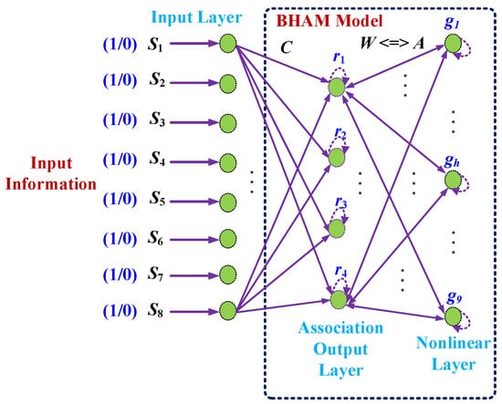 Associative memory machine learning methods can be classified as auto-associative and hetero-associative (BHAM). The latter employs a feedback mechanism, which allows the synthesis of new model patterns and noise filters [18,19,20]. The network includes an input layer, an output layer, and a network connection layer. This type of model saves high-dimensional training models in the connection and correlation matrix and then uses human cognition to construct a model. The weights applied to input data are encoded in the weighting matrix based on various conditions. By reducing the 256 groups of input–output matched training data for each patient, the BHAM model resolves the problem of non-linear identification.