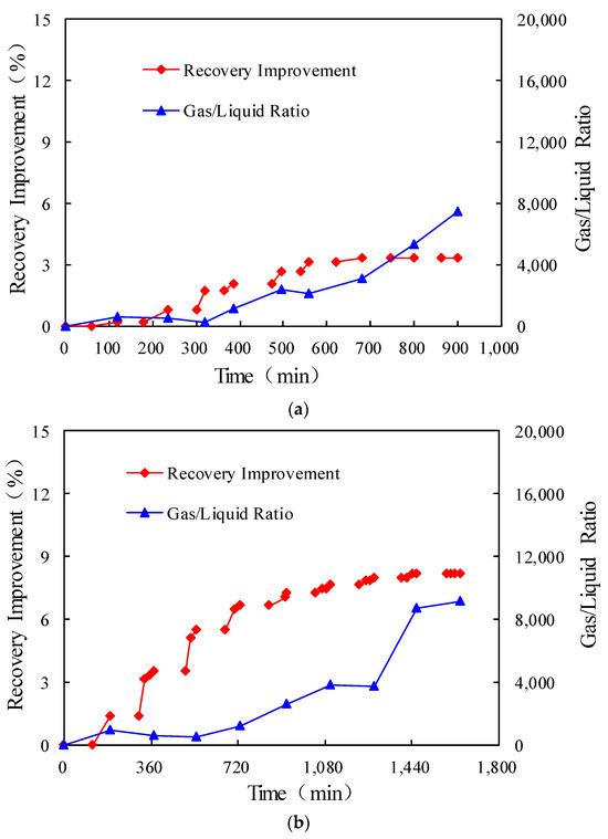As can be seen from the Scheme JX-1 to Scheme JX-4 in Figure 4, the oil recovery improves with the increase in cycle time, and the increment changes little after the cycle time reaches 360 min. This is because the natural gas needs enough time to disperse in the pore throat and to enhance the micro-swept volume. If the cycle time is insufficient, the effect of IGI mentioned above stops. Thus, the cycle time of IGI, especially for the time at the pause stage, should be long enough to accommodate the process. According to the experimental results, the suitable cycle time of IGI after the continuous natural gas flooding in the ultra-low-permeability reservoir is 360 min.