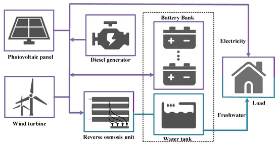 Figure 1 gives a schematic of an HES with multiple types of storage devices driving a ROD process. In Figure 1, the renewable energy generation system, including a photovoltaic panel, a wind turbine, and a diesel generator are used to supply power for the load and ROD unit. The storage system in this HES may contain two types of energy forms, i.e., electricity and freshwater. For the electricity, the battery bank with various battery technologies is adopted, and water tank is used to buffer the mismatches between the freshwater supply and demand. For the load of the system, electricity and freshwater requirements should be satisfied simultaneously in this work, on the premise of meeting the renewable energy penetration requirement of the proposed system.