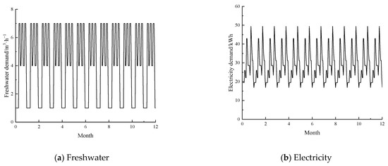For the HES with multiple types of storage devices to supply the ROD unit, regular days of each month are selected to illustrate the variabilities of the renewable generation systems, and the capacity factors of the photovoltaic panel and the wind turbine are given in Figure 2. In this work, the freshwater and electricity requirements of each month are assumed to be equal, which can be seen in Figure 3. The primary parameters of photovoltaic panel, wind turbine, diesel generator, battery bank, ROD unit, and water tank are listed in Table 1. The lifespan of the system is 20 years and the interest rate is 10% in this case study. For the diesel generator, the coefficients a and b are set to 0.08145 L·kWh−1 and 0.246 L·kWh−1, the operating power is set between the 30% and 90% of its rated capacity, and the fuel price is 0.75 USD·L−1 [30]. For the ROD unit, the membrane replacement and chemical costs are 0.06 USD·m−3, the number of membrane replacements per year is two, and 1 m3 freshwater requires 4 kWh of electricity [36]. The operating power of the ROD unit should be greater than 25% of its rated capacity [38]. For the storage side, the efficiency, lifetime cycle, and state-of-charge limits of each battery can be referred to in the literature [39]. It should be noted that this paper is focused on the optimization of the HES, thus the detailed design of the ROD unit is not considered.