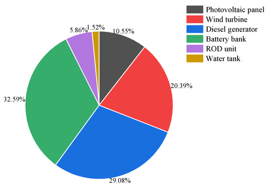 Figure 4 shows the cost compositions of the HES with multiple types of storage devices to power the ROD unit, where the costs of the system include the cost of each component. It can be seen in Figure 4 that the cost of the energy supply side accounts for 60.02%, while the cost of the storage side accounts for 34.12%. For the renewable energy generation, the cost of wind turbines has a relatively large proportion, 20.39%, while the cost proportion of photovoltaic panels is only 10.55%. This demonstrates that wind turbines are superior to photovoltaic panels in the proposed system. The cost proportion of the diesel generator is the second largest, 37.84%, because of its flexible output-power characteristics and relatively lower capital and operating costs, which can be referred in Table 1 and Section 3.2.2. For the storage system, the cost of the battery bank has the largest proportion, 32.59%, and this implies that the battery bank plays a vital role in keeping the balance of the supply side and demand.